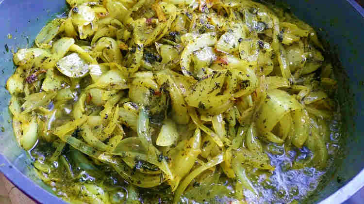 בוזקים מעל כל צלחת רצועות בצל שטוגנו בשמן עם כורכום ואבקת נענע יבשה (לפי הטעם) ומגישים לצד לימון טרי או יוגורט.
