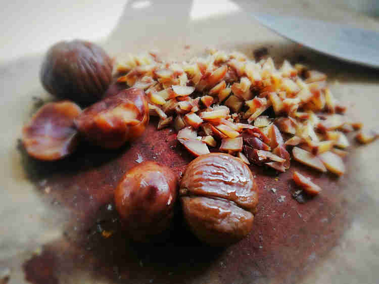 אז אזוקי, ערמונים ושיטאקה יש כבר, ואיתם גם אטריות עמילן שעועית קצוצות שיקנו למלית מרקם אורירי יותר ובצל ירוק וג'ינג'ר, שיתנו למילוי אנרגטיקה מחממת ויקלילו קצת את המרקם הדחוס. לטעם המלוח תרמה גם משחת מיסו כהה שעשויה מפולי סויה מותססים ומעניקה למילוי מליחות עדינה.
