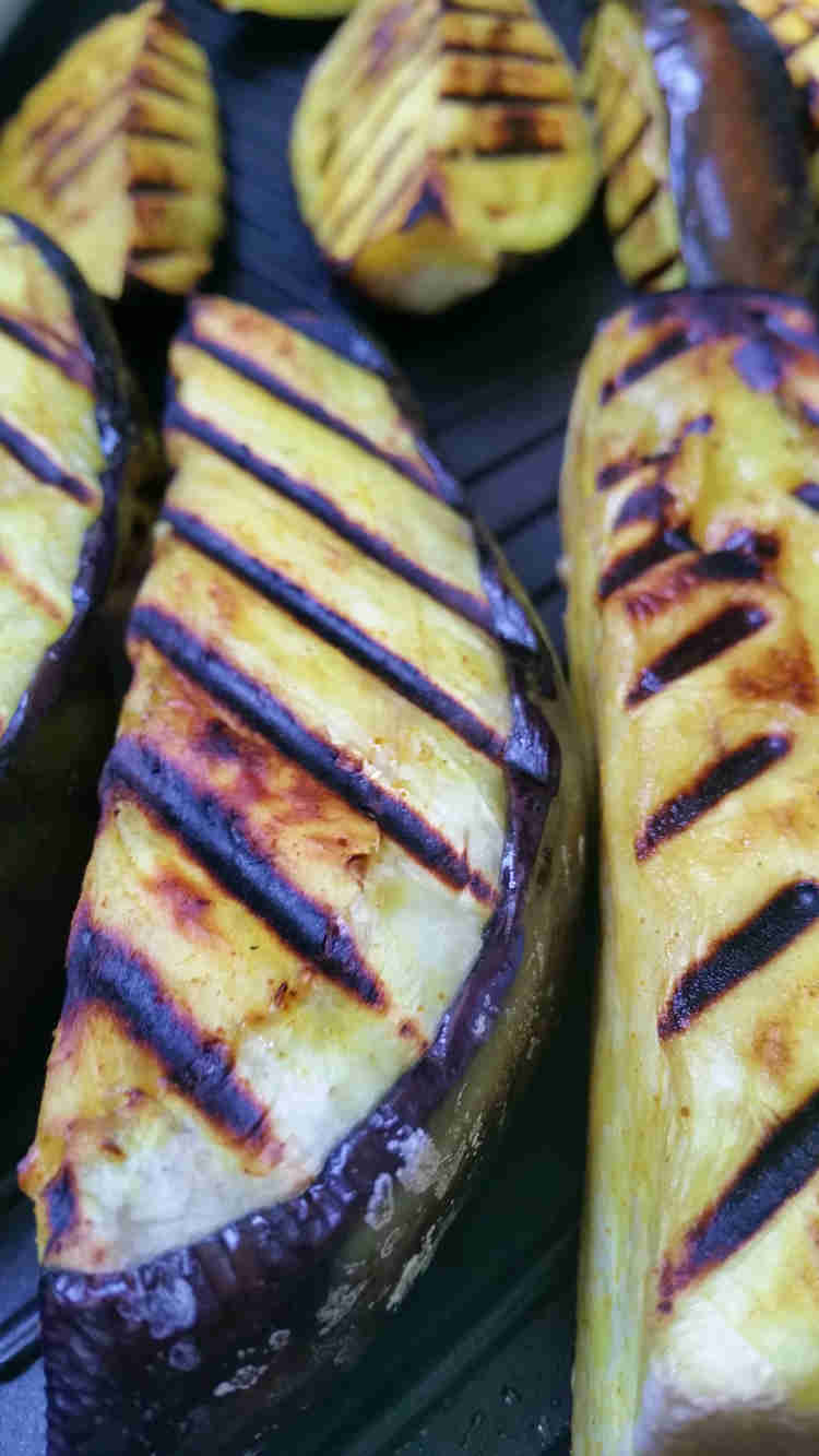 צורבים את פרוסות החציל על מחבת פסים ומניחים בצד.
